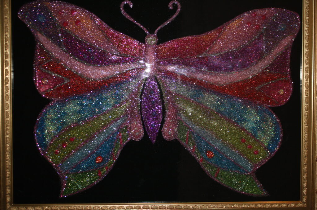 Vlinder geschilderd op doek. Daarna ieder stukje apart met speciale lijm en glitter bewerkt. Vervolgens een paar lagen met Epoxi eroverheen en dit is het resultaat geworden. Met een prachtige lijst.